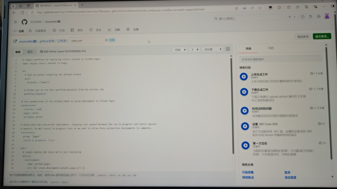 Commit changes..,部署成功后可在广域网中访问https://你的用户名.github.io/你复刻自定义的仓库名查看网页