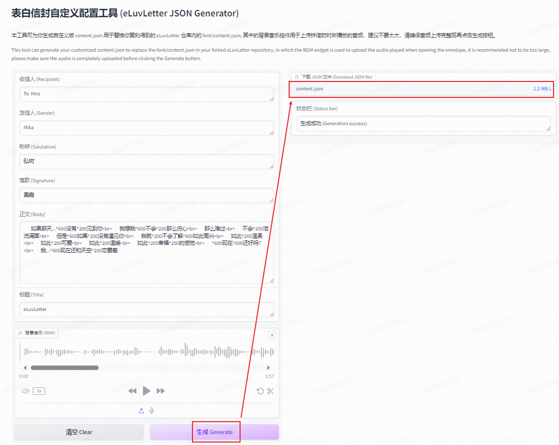使用 表白信封自定义配置工具 生成你自定义的content.json并替换: