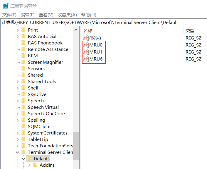 计算机\HKEY_CURRENT_USER\SOFTWARE\Microsoft\Terminal Server Client\Default