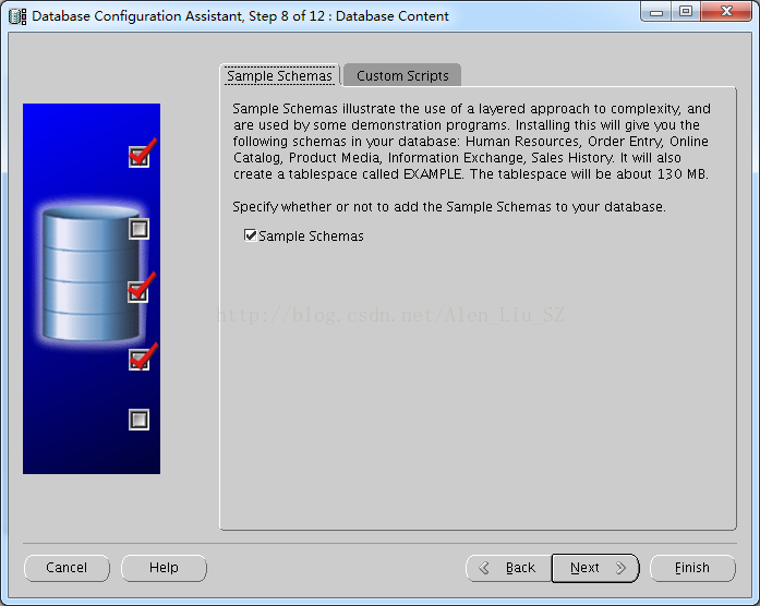 9.勾选Sample Schemas,安装样本数据库