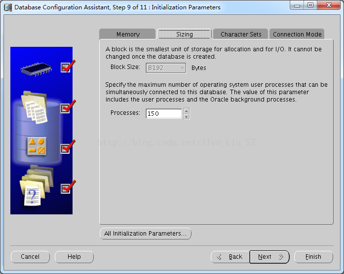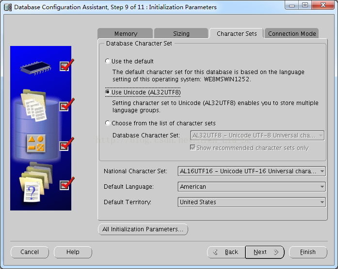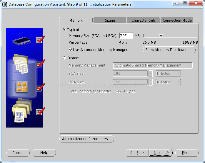 10.设置初始化参数(不懂默认即可),分别设置Memory,Sizing,Character Set