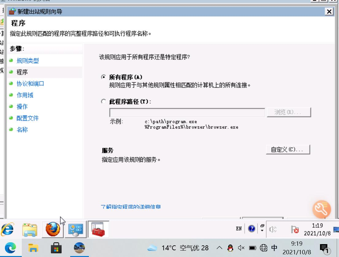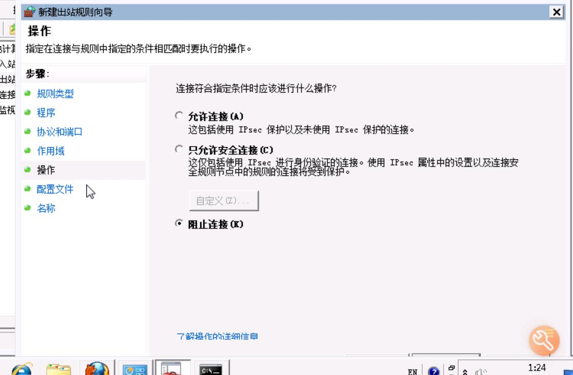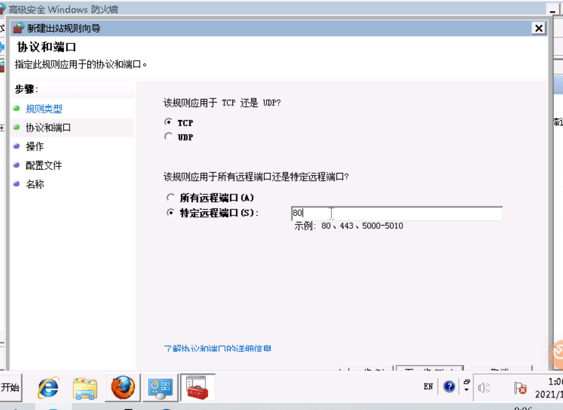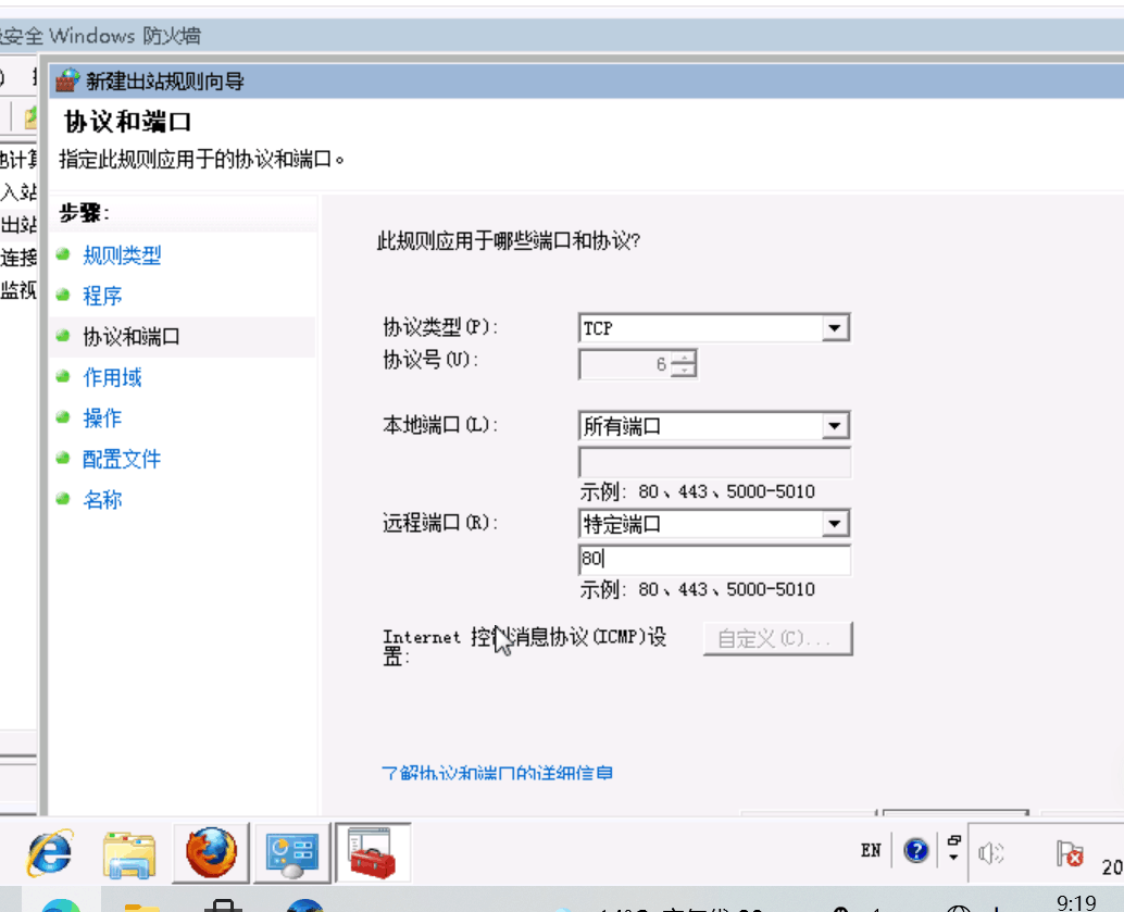 1.新建出站规则,选择TCP协议,端口80,配置成允许访问。