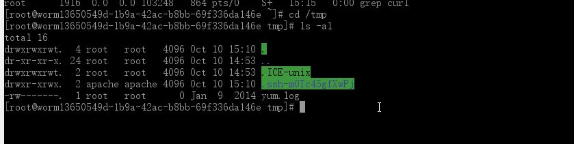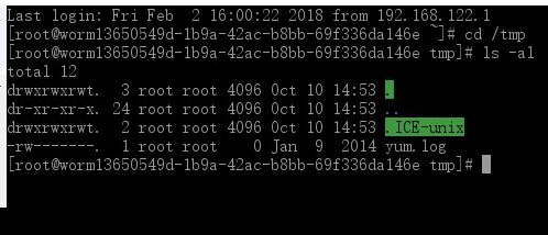 .经过一段时间之后(大约10分钟),登录Worm2。同样使用命令:”ls -al /tmp”查看,可以发现主机也被此蠕虫感染。对比效果如下图: