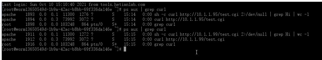 1.登录Worm1(10.1.1.12),不断的执行命令:“ps aux |grep curl”可以看到蠕虫的传播过程,被感染的Worm1通过agent.1337进程,不断的向同网段的其他主机发起攻击与感染。