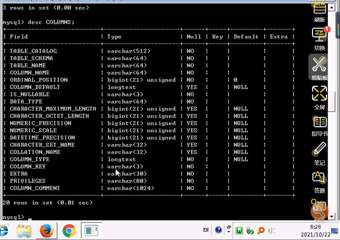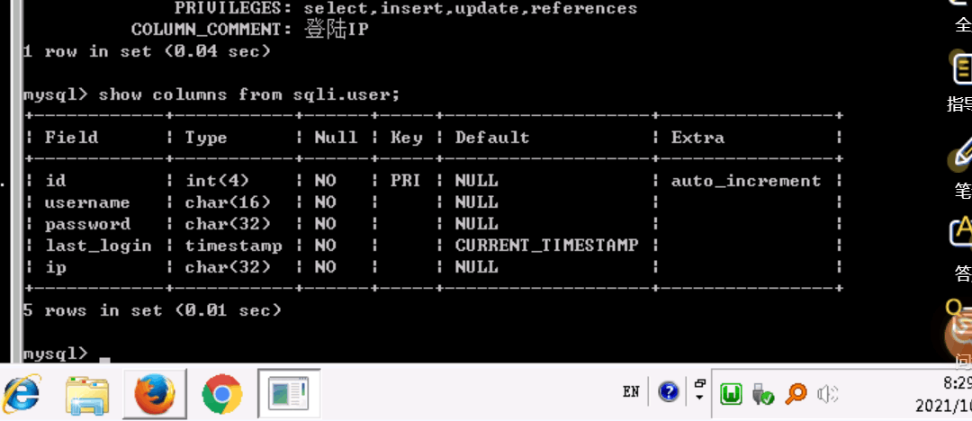 通过本次实验,掌握SQL注入中,通过information_schema这个数据库爆库名、表名以及字段名的原理。