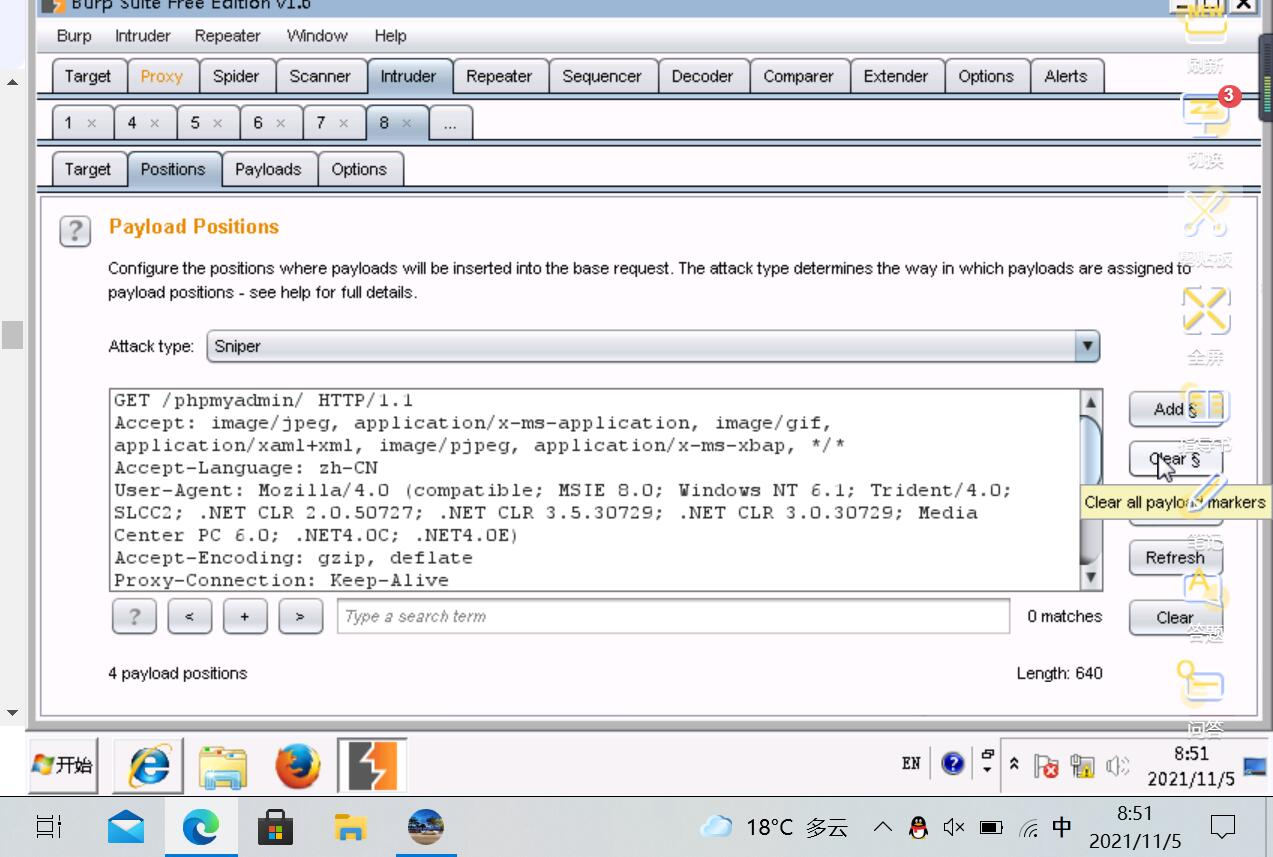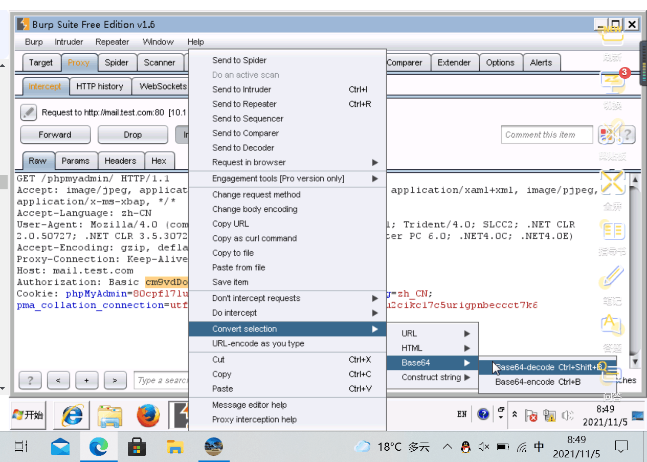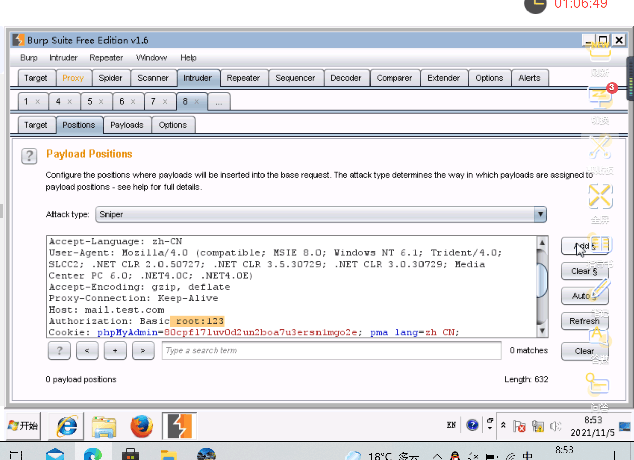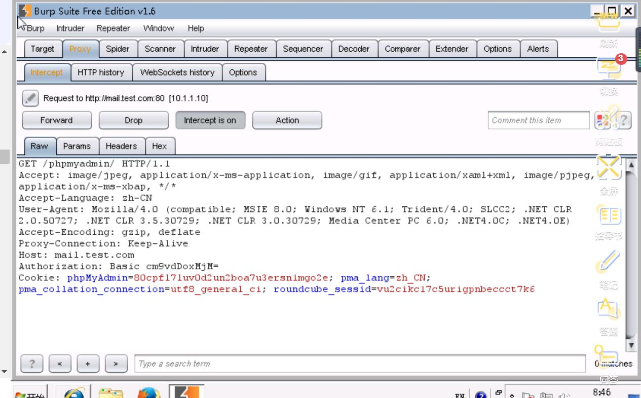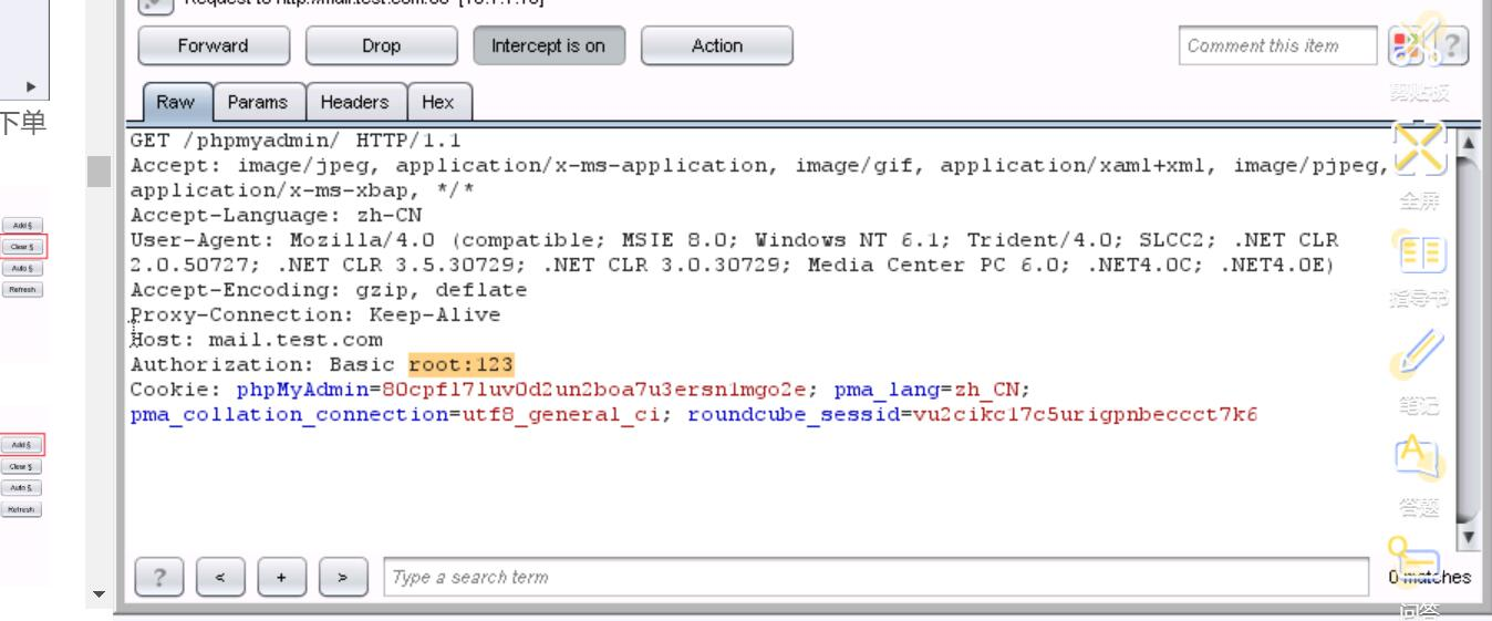 5、接下来对phpmyadmin进行暴力破解,随便输入一个用户名和密码,比如此处我输入:用户名:root 密码:123,页面提示错误,然后查看burpsuite截获到的数据包。