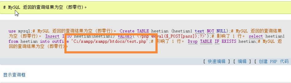 select heetian1 from heetian into outfile 'C:/xampp/xampp/htdocs/test.php'; //使用Mysql中outfile函数将其导出到test.php