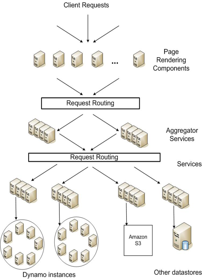 Amazon电子商务*台由数百个服务组成,它们协同工作,提供的功能包括建议,完成订单到欺诈检测。每个服务是通过一个明确的公开接口,通过网络访问。这些服务运行在位于世界各地的许多数据中心的数万台服务器组成的基础设施之上。其中一些服务是无状态(比如,一些服务只是收集(aggregate)其他服务的response),有些是有状态的(比如,通过使用持久性存储区中的状态,,执行业务逻辑,进而生成response)。