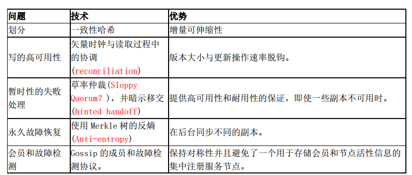 一个操作在生产环境里的存储系统的架构是复杂的。除了实际的数据持久化组件,系统需要有负载*衡,成员(membership)和故障检测,故障恢复,副本同步,过载处理,状态转移,并发性和工作调度,请求marshaling,请求路由,系统监控和报警,以及配置管理等可扩展的且强大的解决方案。描述解决方案的每一个细节是不可能的,因此本文的重点是核心技术在分布式系统中使用Dynamo:划分(partitioning),复制(replication),版本(versioning),会员(membership),故障处理(failure handling)和伸缩性(scaling)。表1给出了简要的Dynamo使用的技术清单和各自的优势。