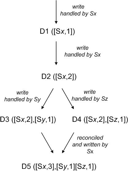 - 让我们假设,同样的客户端更新这个对象但不同的服务器(比如Sy)处理了该请求。目前该系统具有数据D3及其相关的时钟[(Sx,2),(Sy,1)]。