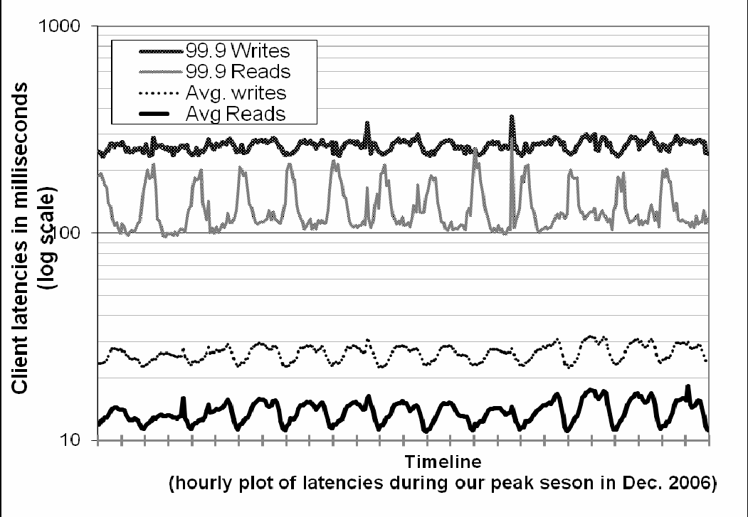 虽然Dynamo的主要的设计目标是建立一个高度可用的数据存储,性能是在Amazon*台中是一个同样重要的衡量标准。如前所述,为客户提供一致的客户体验,Amazon的服务定在较高的百分位(如99.9或99.99),一个典型的使用Dynamo的服务的SLA要求99.9%的读取和写入请求在300毫秒内完成。