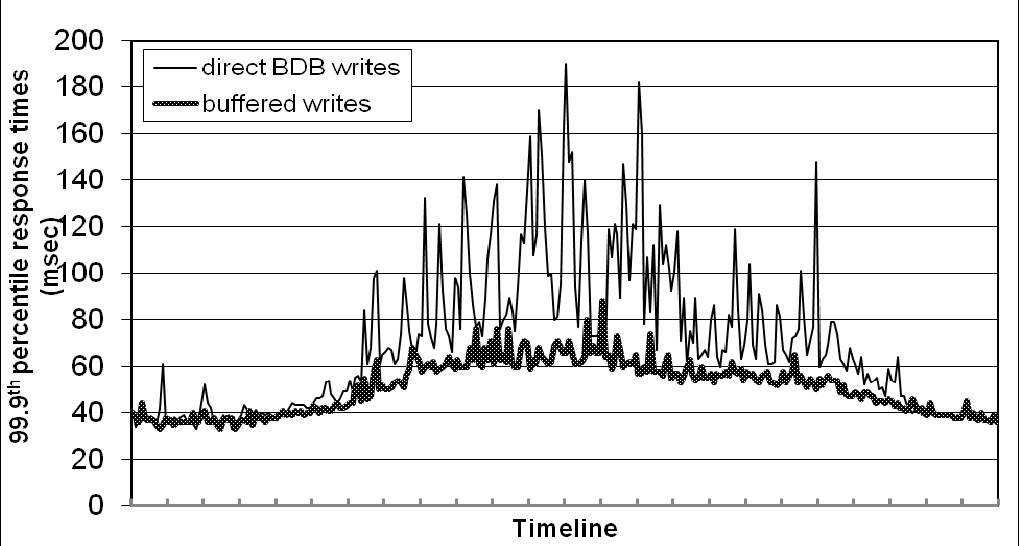 这种优化的结果是99.9百位在流量高峰期间的延时降低达5倍之多,即使是一千个对象(参见图5)的非常小的缓冲区。此外,如图中所示,写缓冲在较高百分位具有*滑延时。显然,这个方案是*衡耐久性来提高性能的。在这个方案中,服务器崩溃可能会导致写操作丢失,即那些在缓冲区队列中的写(还未持久化到存储中的写)。为了减少耐用性风险,更细化的写操作要求协调员选择N副本中的一个执行“持久写”。由于协调员只需等待W个响应(译,这里讨论的这种情况包含W-1个缓冲区写,1个持久化写),写操作的性能不会因为单一一个副本的持久化写而受到影响。