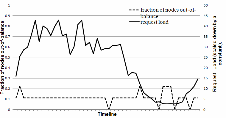 为了研究负载不*衡与请求负载的相关性,通过测量各个节点在24小时内收到的请求总数-细分为30分钟一段。在一个给定的时间窗口,如果该节点的请求负载偏离*均负载没有超过某个阈值(这里15%),认为一个节点被认为是“*衡的”。否则,节点被认为是“失去*衡”。图6给出了一部分在这段时间内“失去*衡”的节点(以下简称“失衡比例”)。作为参考,整个系统在这段时间内收到的相应的请求负载也被绘制。正如图所示,不*衡率随着负载的增加而下降。例如,在低负荷时,不*衡率高达20%,在高负荷高接*10%。直观地说,这可以解释为,在高负荷时大量流行键(popular key)访问且由于key的均匀分布,负载最终均匀分布。然而,在(其中负载为高峰负载的八分之一)低负载下,当更少的流行键被访问,将导致一个比较高的负载不*衡。
