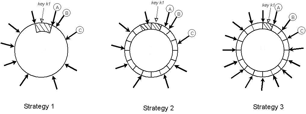 策略3:每个节点Q/S个Token,大小相等的分区:类似策略2,这一策略空间划分成同样大小为Q的散列分区,以及分区布局(placement of partition)与划分方法(partitioning scheme)脱钩。此外,每个节点被分配Q/S个Token其中S是系统的节点数。当一个节点离开系统,为使这些属性被保留,它的Token随机分发到其他节点。同样,当一个节点加入系统,新节点将通过一种可以保留这种属性的方式从系统的其他节点“偷”Token。
