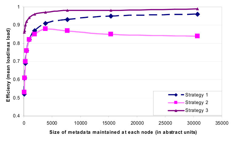 对这三个策略的效率评估使用S=30和N=3配置的系统。然而,以一个比较公*的方式这些不同的策略是很难的,因为不同的策略有不同的配置来调整他们的效率。例如,策略1取决于负荷的适当分配(即T),而策略3信赖于分区的个数(即Q)。一个公*的比较方式是在所有策略中使用相同数量的空间来维持他们的成员信息时,通过评估负荷分布的偏斜. 例如,策略1每个节点需要维护所有环内的Token位置,策略3每个节点需要维护分配到每个节点的分区信息。