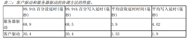 表二:客户驱动和服务器驱动的协调方法的性能。