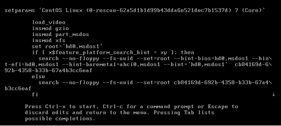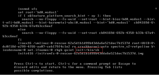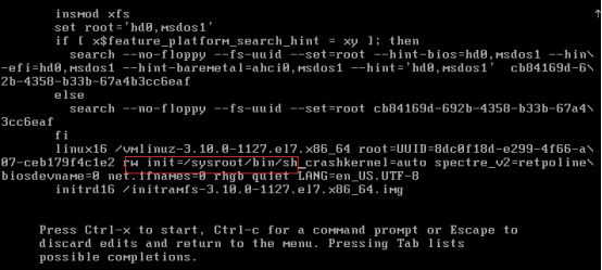2找到ro并替换成rw init=/sysroot/bin/sh,ctrl+x执行启动