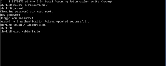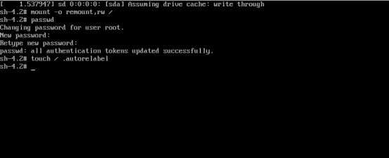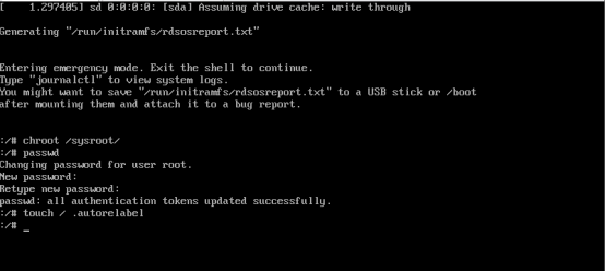 3. 依次执行chroot /sysroot/ passwd touch / .autorelabel