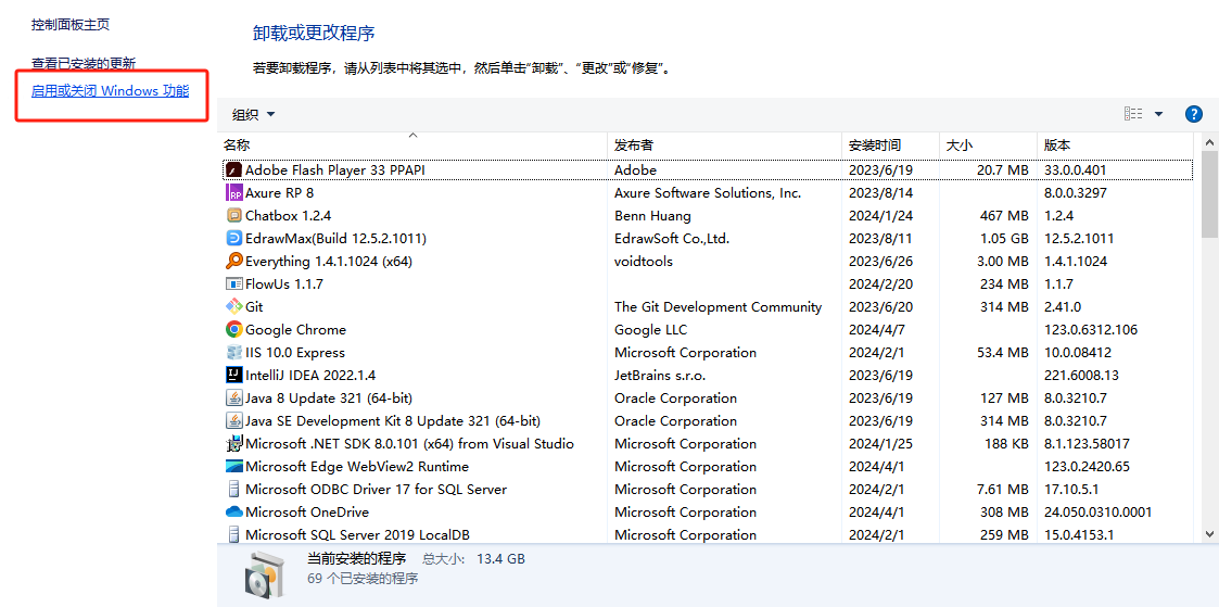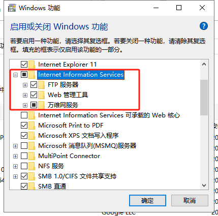 打开控制面板—>程序—>启动或关闭windows功能,找到互联网信息服务勾选✔其中的ftp服务器,web管理,万维网服务,系统就会安装IIS服务管理器了,安装过程可能需要等待几分钟。