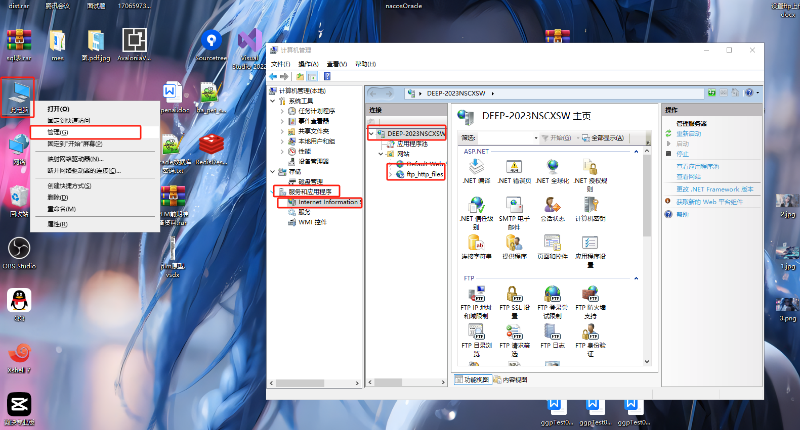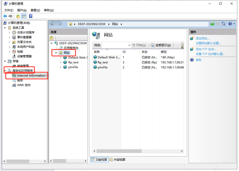 回到电脑桌面,右击“计算机”,点击 管理,进入计算机管理界面。在这里,我们就可以看到刚刚添加的IIS服务,接下来的操作就像我们在VPS主机上添加网站差不多的操作步骤了。选中IIS服务——>网站——>右键添加FTP站点