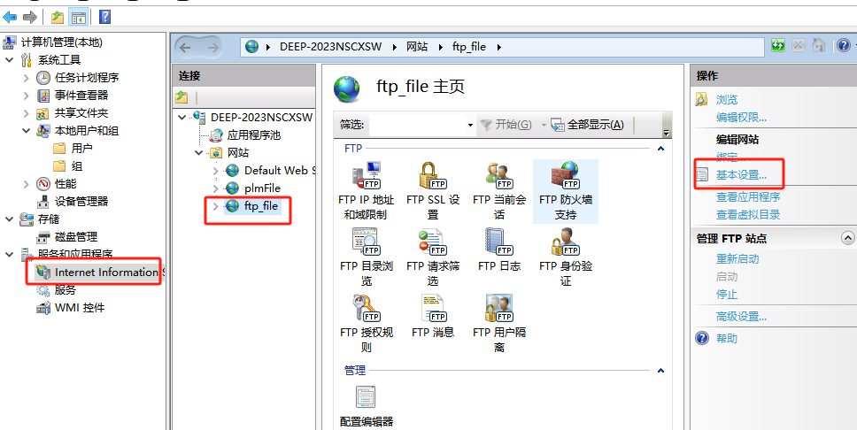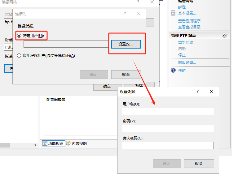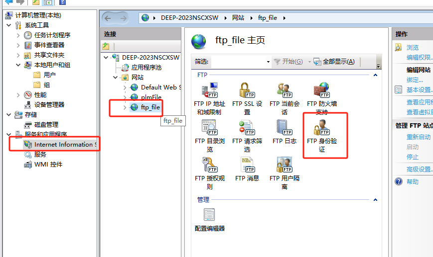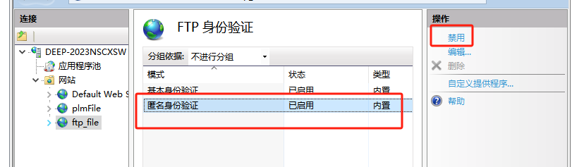 点击创建的ftp名称—>ftp身份验证—>修改身份认证,禁止匿名身份,双击进入