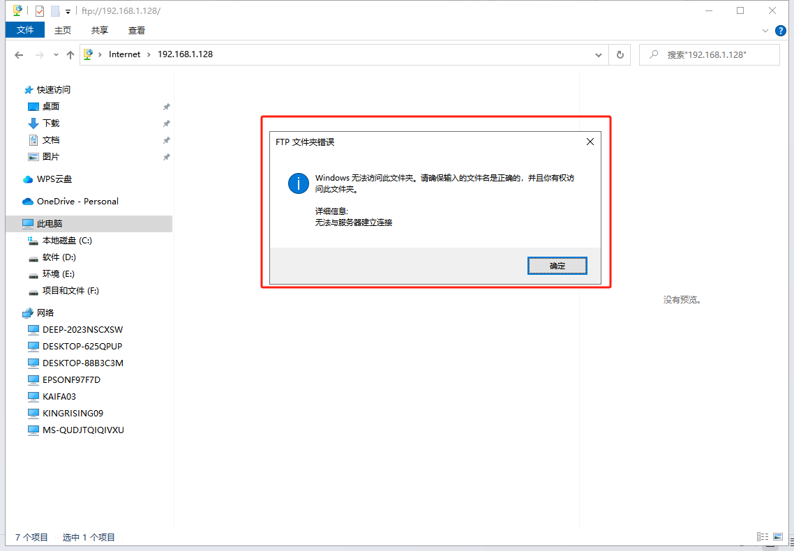 注意:如果输入后弹出FTP文件夹错误,需要查看一下防火墙是否放行FTP服务器