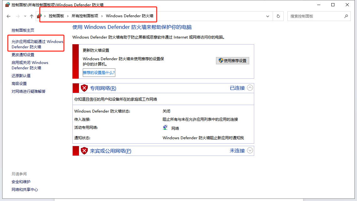 打开防火墙,点击允许应用或功能通过Windows Defender防火墙