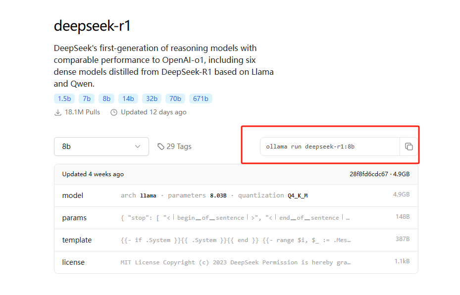 2.选择deepseek-r1这个模型,有很多版本,区别就是参数不一样