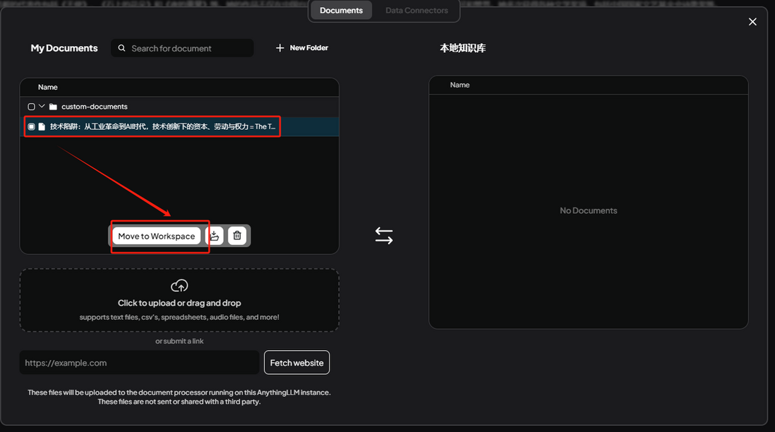 14.并将文档 Move to Workspace,意思是加载到AnythingLLM的本地知识库中。