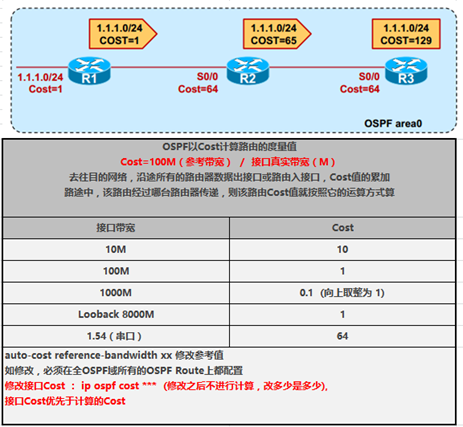 - OSPF路由协议采用cost作为度量标准;