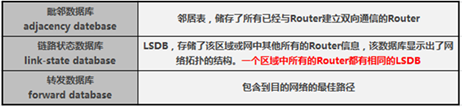在同一个OSPF自制系统内每一台运行OSPF协议的路由器总是将本地网络的连接状态用LSA(链路状态通告)描述,并广播到整个自制系统中去。这样,每台路由器都收到了自制系统中所有路由器生成的LSA,这些LSA的集合组成了LSDB(链路状态数据库),这样所有的OSPF路由器都维护一个相同的描述自治系统内部结构的数据库。