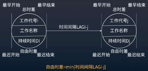 (4)自由时差,所有紧后工作的最早开始时间的最小值减去本工作的最早结束时间。
