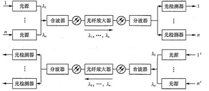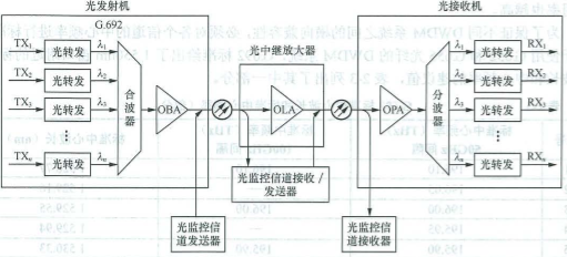 在发送端光后置放大之后,将波长的光监控信道插入到主信道之中;在接收端光前 置放大之前,取出(分离出)光监控信道。