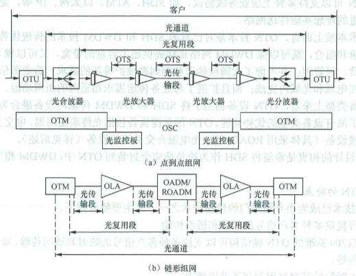 • 光复用段:对于点到点组网,发端 OTM 中的合波器输出点与收端 OTM 中的分波器输入点之间称为光复用段,发端 OTM 中的合波器与 ROADM/OADM 之间、 ROADM/OADM 与收端 OTM 中的分波器之间称为光复用段。