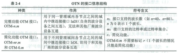 用于支持 OTN 接口 (OTN 设备与光传输线路之间的接口)的信息结构被称为光传送模块OTM-n, 分为两种结构:完整功能 OTM 接口信息结构 OTM-n.m 和简化功能 OTM 接口信 息结构 (OTM-nr.m 和 OTM-O.m)。