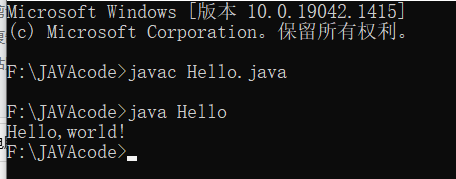 在cmd窗口键入javac Hello.java(生成class文件),再键入java Hello,即可输出Hello,world!