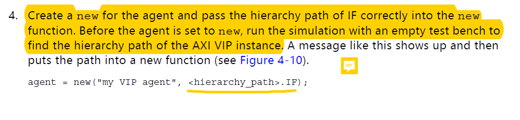 4)然后便是为agent绑定AXI VIP,可以理解为赋值,如下图所示。此处的<hierarchy_path>便是之前在Tcl窗口下输出的Path,以axi4lite_master为例,此处是tb_top.dut.design_1_i.axi4lite_master.inst。tb_top不加。