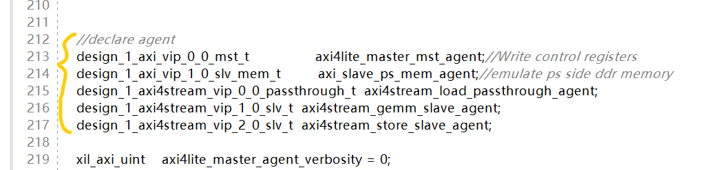 3)然后便是声明AXI VIp的agent,该代理用来连接动态和静态区域,具体相关内容可以看手册。不同功能类型的AXI VIP对应着不同的类,而且类的名字与component_name相关,如下图所示。同样以axi4lite_master为例,对应的声明为design_1_axi_vip_0_0_mst_t axi4lite_master_mst_agent;