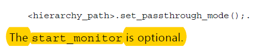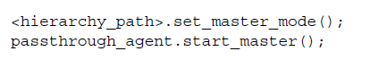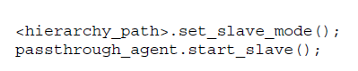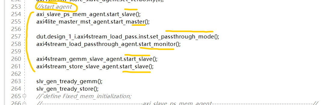 6. 启动各个agent,作为slave功能的VIP代理使用start_slave, master功能的VIP代理使用start_master, passthrough功能的AXI-Stream VIP需要设置为passthrough模式,然后使用start_monitor启动监测功能。这里的启动并不是意味着立马就会工作,只是处于了可工作状态,对于slave来说就是可以接受数据了,具体的接收数据还有专门的函数负责,对于master来说就是可以发送数据了,具体的发送、等待回应还会有具体的函数实现。