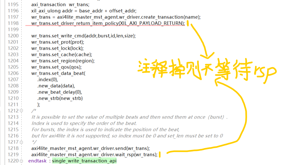 6)随后可以选择等待rsp,rsp信息返回后会赋值在同一个axi_transaction实例的参数bresp中,或者直接不等待响应,具体的类中元素需要查看示例代码和源码。