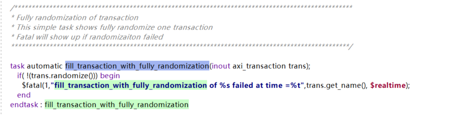 4)这个数据是axi_transaction类型的(一个类),该类里面包含了数据和AXI总线相关的一系列参数,需要将关键的参数赋值,手册强烈建议使用随机赋值,是怕用户出现某些值未赋值而导致出错,可以先采取随机赋值,随后固定赋值覆盖的方式来解决,或者采用example design中提供的打包好的API来设置其中的内容。