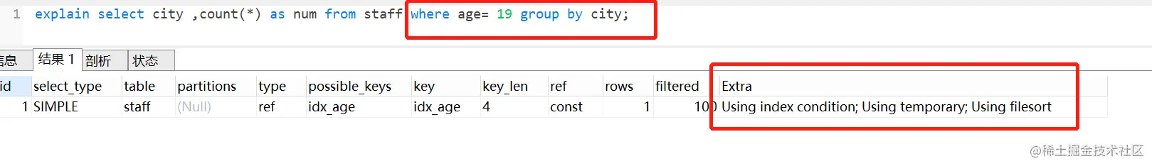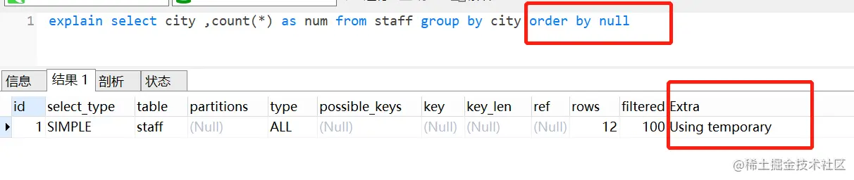 执行计划的Extra字段可以看到,执行没有再使用临时表,而是只有排序