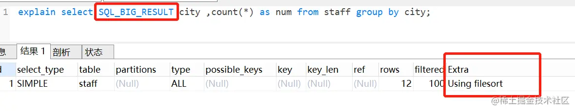 因此,如果预估数据量比较大,我们使用SQL_BIG_RESULT 这个提示直接用磁盘临时表。MySQl优化器发现,磁盘临时表是B+树存储,存储效率不如数组来得高。因此会直接用数组来存