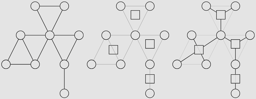 圆方树:原图中的每个点对应树中的圆点,原图中每个点双对应树中的方点。方点与圆点之间有边当且仅当原图中圆点对应的点属于方点对应的点双。