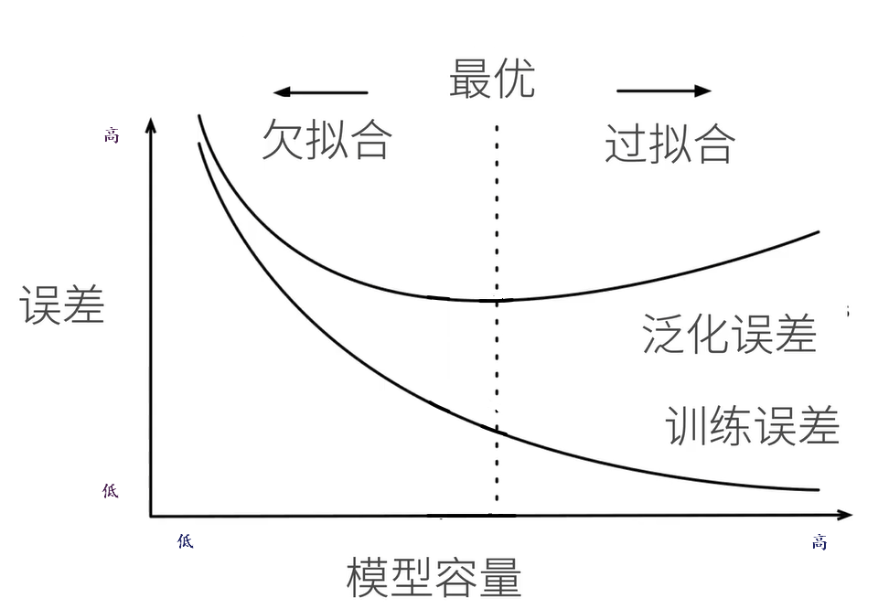 对于过拟合,模型往往只“记住”训练集的数据,而没有“理解”其背后的规律。高容量的模型由于其自身的灵活性,容易产生过拟合现象。但验证误差和训练误差之间的差距较大并不总是一件坏事,在深度学习领域,即使是最好的预测模型在训练集上的表现往往比在验证集上好,因此我们通常关心训练误差,而非二者间的差距。
