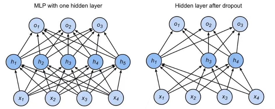 对于这个隐藏层,部分节点被随机删除,而整个层元素的期望值不变。一种理解方式是,暂退法相当于同时训练了 \(2^m\) 个“子网络”(\(m\) 是进行暂退法的层的元素个数之和),最后做模型平均,减小泛化误差。