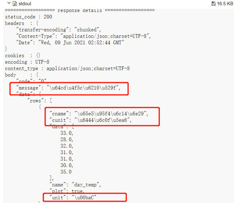 #修改了第37行(client.py文件中的第37行)代码 def log_print(req_or_resp, r_type): msg = f"\n================== {r_type} details ==================\n" for key, value in req_or_resp.dict().items(): if isinstance(value, dict): value = json.dumps(value, indent=4,ensure_ascii=False)