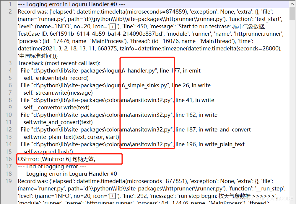 1、若是报错提示 OSError: [WinError 6] 句柄无效,请参考如下解决:(参考文档为https://github.com/httprunner/httprunner/issues/987)