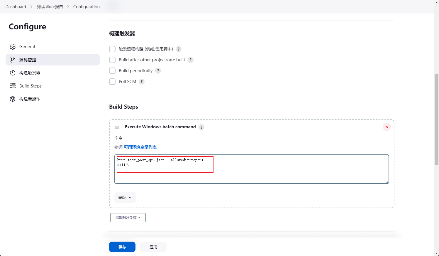 6、指定构建后生成的Allure报告文件夹名字(我的文件夹名字为report),用来保存生成Html报告前所依赖的JSON、txt等格式的源文件