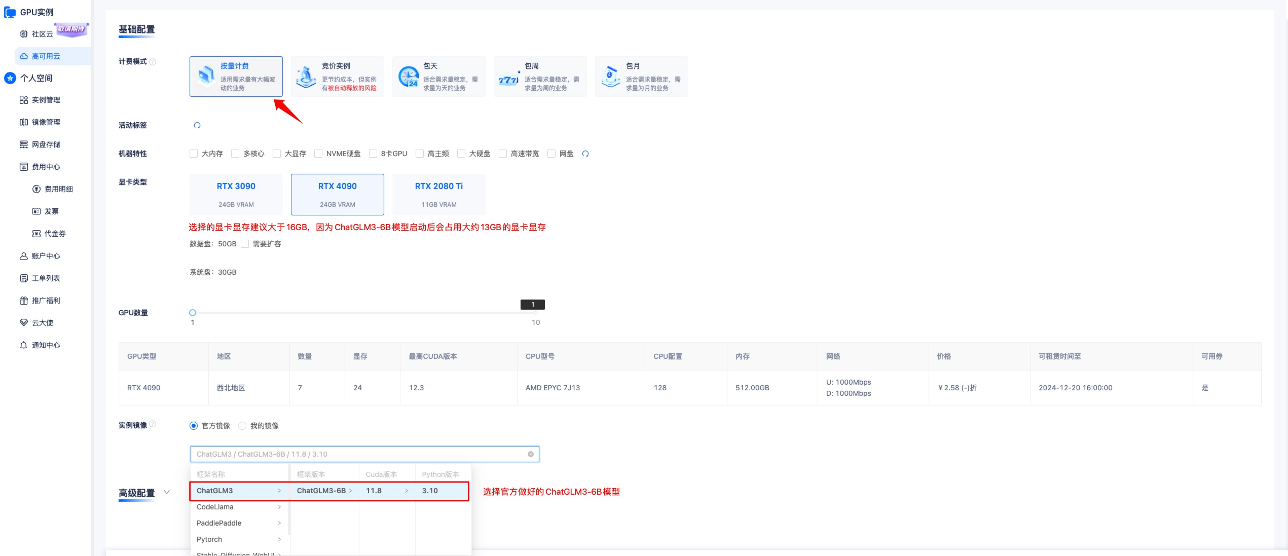 - 选择 ChatGLM3-6B 镜像创建实例